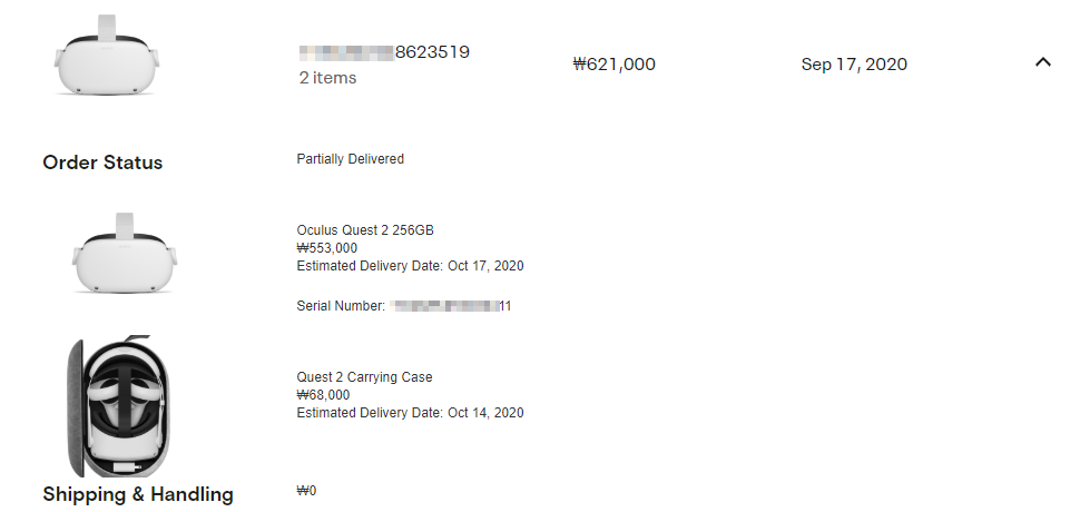 2. 기본정보 확인법은 오큘러스 홈페이지에 들어가서 주문내역에 들어가면 구매내역 캡쳐도 되고 시리얼넘버까지 다 있음