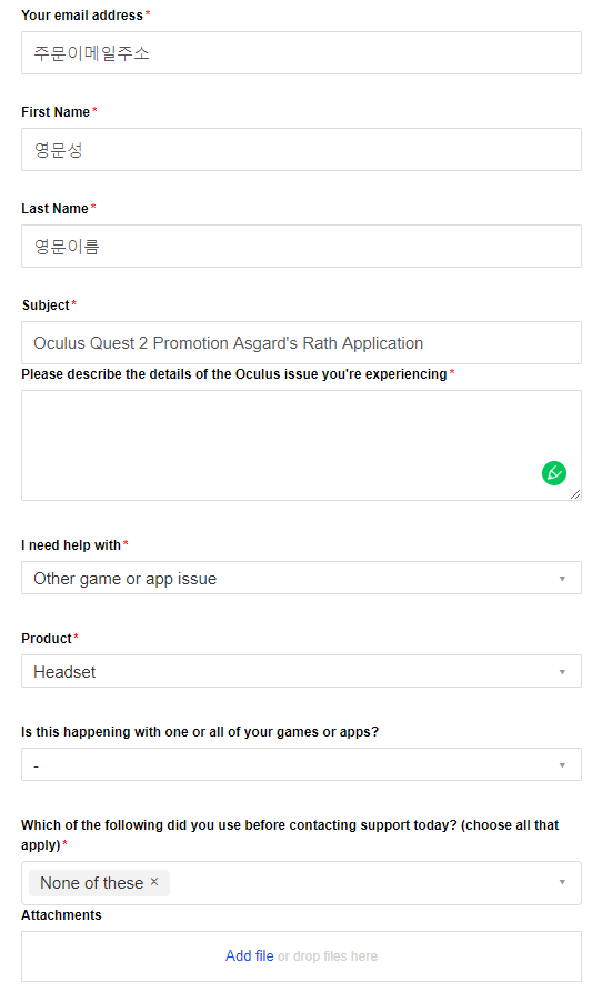 - 기본정보 요구사항 : 제품시리얼넘버, 주문번호, 주문날짜, 오큘러스 유저네임, 구매시 이용했던 이메일, 구매내역 캡쳐
