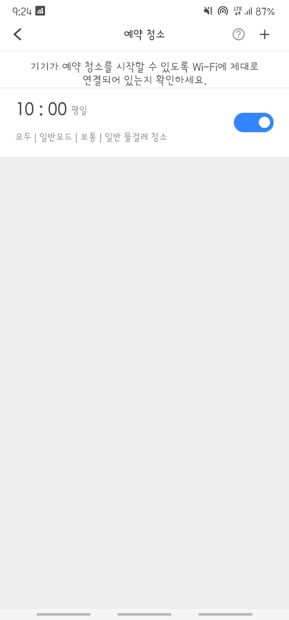 내가 집에 없어도 알아서 청소해 주는 기능입니다. 직장인이라 평일(월~금) 기준으로 출근해 있을 때 10시에 청소하게 맞춰 놨는데 청소를 시작하면 폰으로 알림이 옵니다