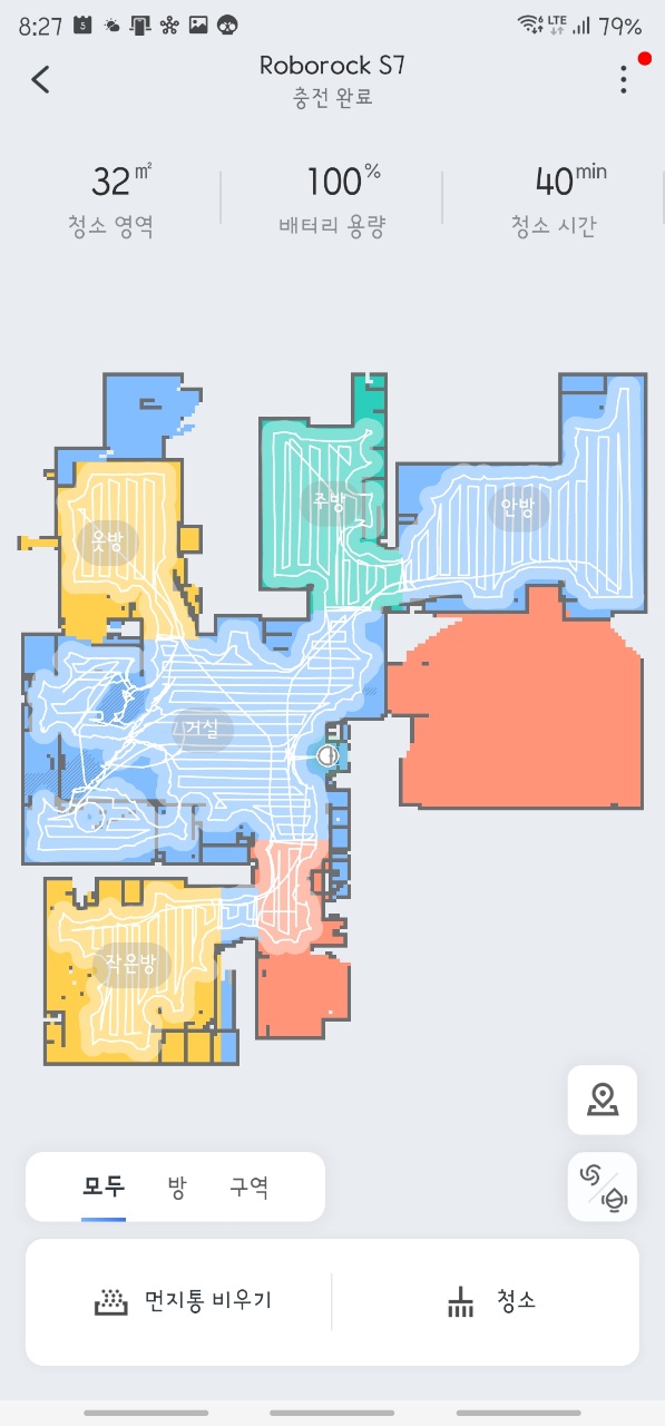 청소를 다 하고 나면 어디를 어떻게 청소했는지 결과를 볼 수 있으며 구역도 표시됩니다. 청소를 안한곳은 화장실이나 다용도실 입니다