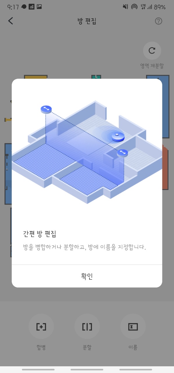 몇 번 청소기가 센서로 청소하고 나면 적당히 방구조를 구분해주는데 방편집을 통해 좀 더 세밀하게 할 수 있습니다.