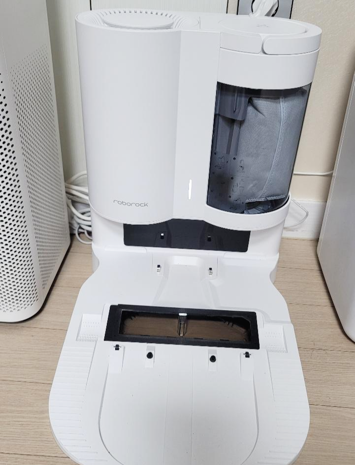 로봇청소기가 열심히 일하고 청소후에는 독으로 돌아가서 충전을 하는데 이때 먼지통을 자동으로 비웁니다.